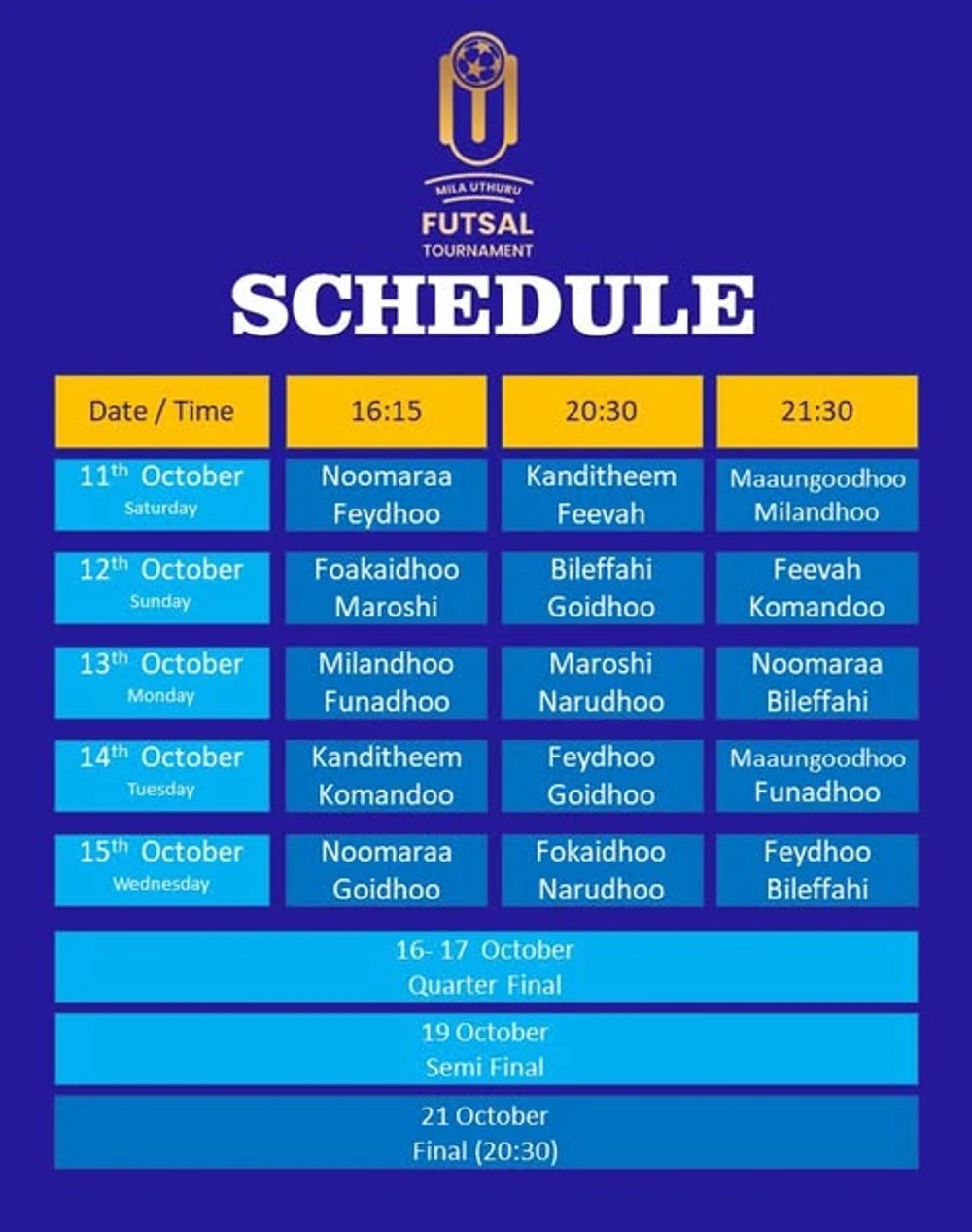 މިލަ އުތުރު ފުޓްސަލް މުބާރާތް ބޭއްވުމަށް ހަމަޖެހިފައިވަނީ އަންނަ އޮކްޓޫބަރު މަހުގެ 11 އިން 21 އަށް ށ.ކަނޑިތީމުގައެވެ. މުބާރާތުގެ ޝެޑިއުލް މިހާރުވަނީ ށ.އަތޮޅުކައުންސިލުގެ ފޭސްބުކް ޕޭޖުގައި ޢާއްމުކުރައްވާފައެވެ.